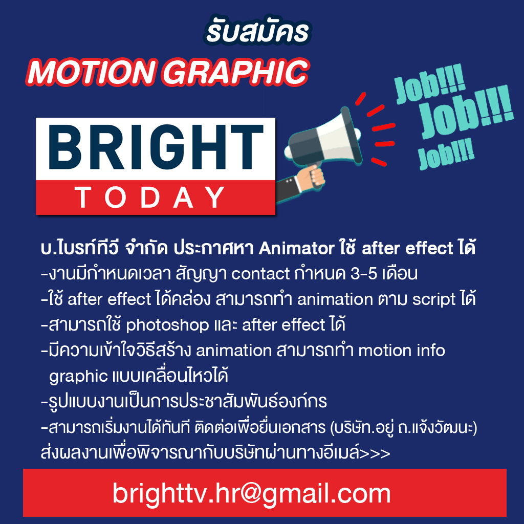 บ.ไบรท์ทีวี จำกัด ประกาศหา Animator ใช้ after effect ได้ ระยะเวลางานสัญญา contact 3-5 เดือนครับ