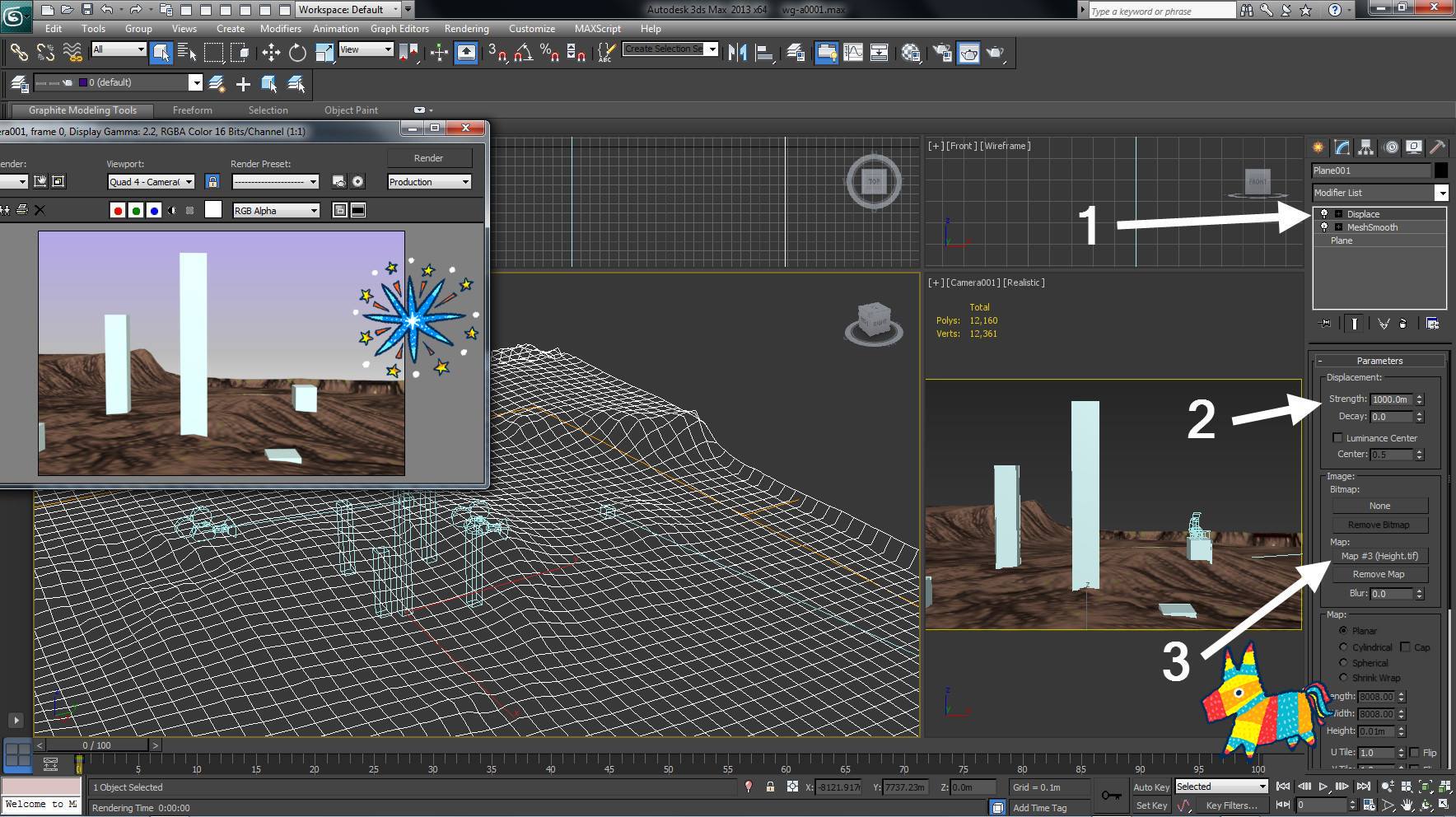 3. นำไฟล์ความสูงที่ยิงออกมาจาก WM มาใส่ ...ส่วน texture ก็ยิงจาก WM มาแปะบน plane อีกที....