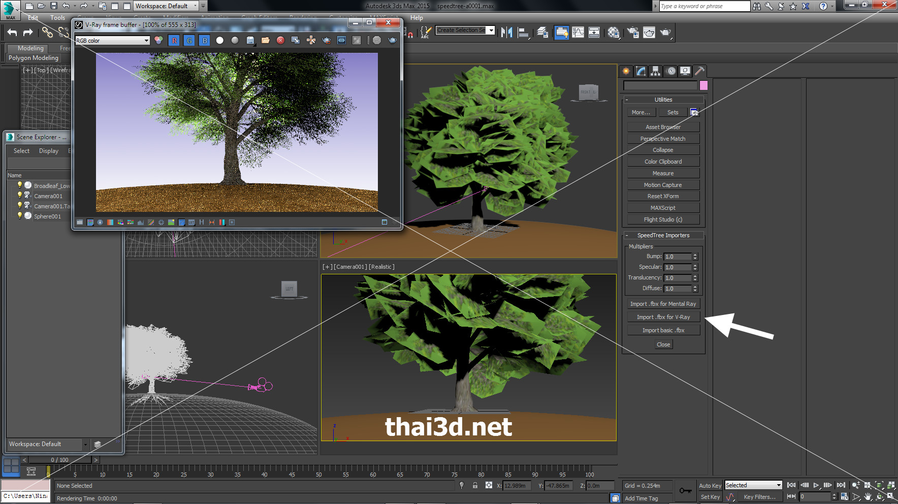 แล้วใน 3ds Max ต้อง import เข้ามาโดย run script "Import fbx for V-Ray" ด้วย (script เขาให้มาแล้ว จะอยู่ใน folder SpeedTree)