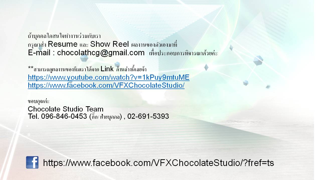 หรือส่ง Resume และ Show Reel ผลงานของตัวเองดูกันก่อนได้จ้ะที่ E-mail : chocolathcg@gmail.com