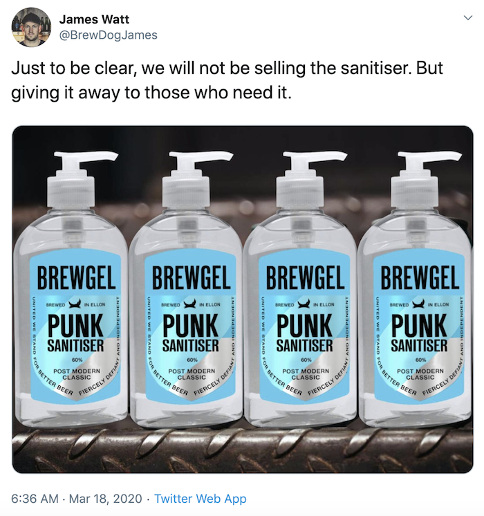 BrewDog บริษัทเบียร์สก็อตแลนด์เปลี่ยนโรงกลั่นเบียร์เป็นแหล่งผลิตเจลล้างมือในช่วงวิกฤติ COVID-19 แถมยังหยิบแบรนด์เบียร์ตัวเอง “Punk” มาใช้กับเจลล้างมือที่บริษัทหันมาผลิตเพื่อแจกฟรีให้ประชาชน ตั้งชื่อ Punk Sanitizer แต่ย้ำว่าเจลนี้ไม่ขาย เพราะ BrewDog ตั้งใจแก้ปัญหาเจลล้างมือฆ่าเชื้อขาดตลาดในสก็อตแลนด์และอังกฤษ