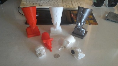 นี่คือพวกชิ้นงานที่พิมพ์ออกมาเทียบขนาดกับเหรียญบาท ตัวไฟล์นั้นหาจากในเน็ท สิ่งที่บอกว่าเพิ่งรู้จริงๆ คือเวลาที่ใช้ต้องบอกว่าไม่เร็วแต่ไม่ใช่ว่าช้าแบบเต่า ตัวอย่างคือตัวช้างหรือหัว T-800 ใช้เวลาพิมพ์