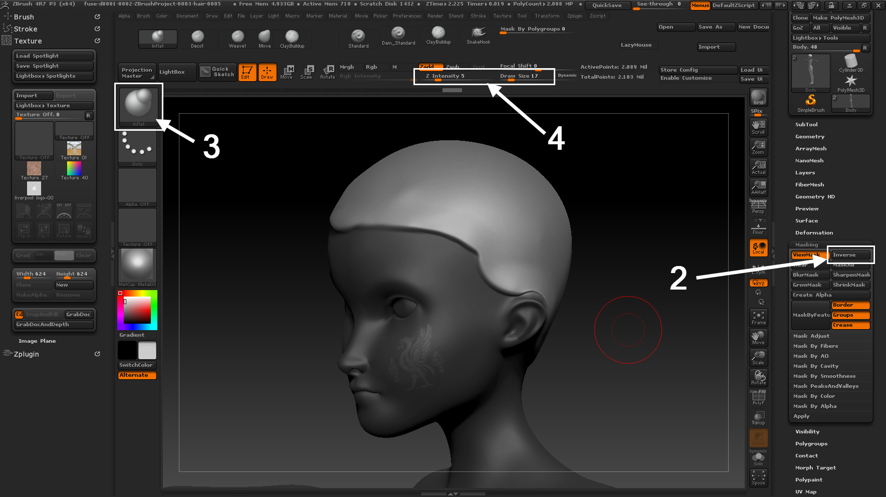4. ปรับ Intensity น้อยๆ และขนาดของ brush ก็ให้เล็กๆ ไว้ก่อน จากนั้นก็ทำการ paint ไปตรงขอบของทรงผมที่ทำ mask ไว้ ให้เกิดความนูนขึ้นมาเล็กน้อย
