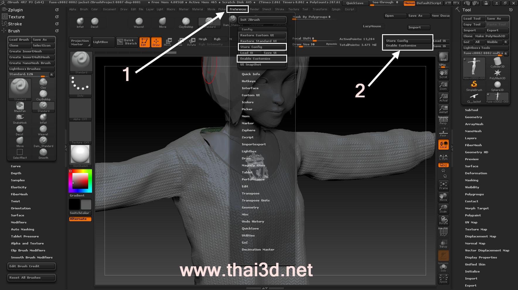 1. เลือก Preferences >> Enable Customize จากนั้นเราอยากให้ปุ่มหรือ brush อะไรมาฝังที่หน้าจอ ก็ให้เรากด Ctrl + Alt ค้างไว้ แล้วลากปุ่มหรือ brush นั้นมาฝังบนหน้าจอด้านบน (ด้านล่างของจอก็ได้ แล้วแต่ชอบ) เมื่อวางจบแล้ว ก็เลือก Preferences >> Store Config เพื่อบันทึกว่าเราย้ายปุ่มหรือ brush มาฝังแล้ว จากนั้นกดปุ่ม Enable Customize ให้มันเด้งกลับขึ้นมา เพื่อจบขั้นตอน