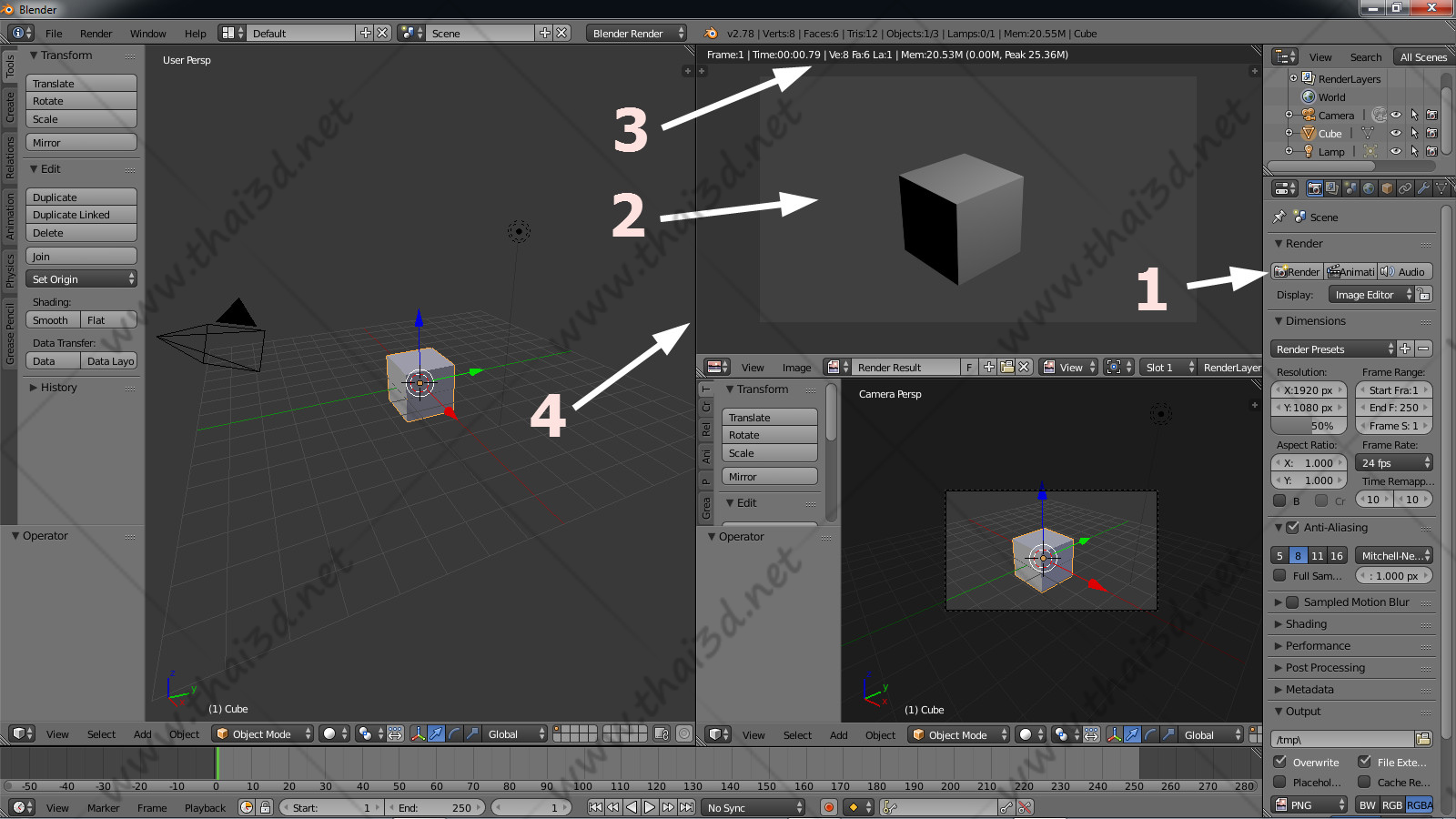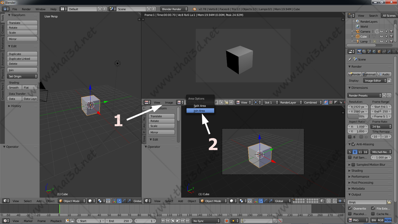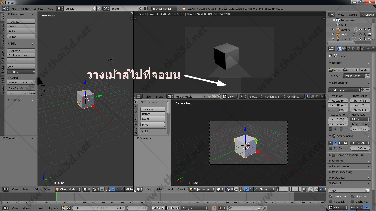 เวลาเปิด Blender เข้ามาแล้ว เราจะปรับหน้าจออย่างไรให้สะดวกต่อการใช้งาน เช่น ผมต้องการแบ่งหน้าจอไว้ทำงานทางซ้าย แล้วทางขวาแบ่งไว้เป็นมุมกล้องและ render ...จะต้องทำอย่างไรบ้าง (คลิกที่ภาพเพื่อชมภาพแบบขนาดใหญ่ได้)