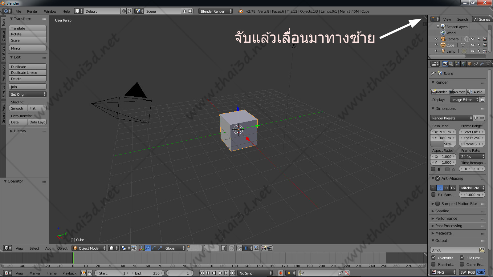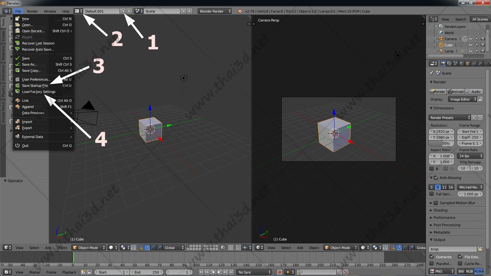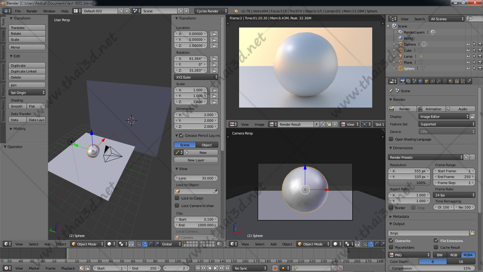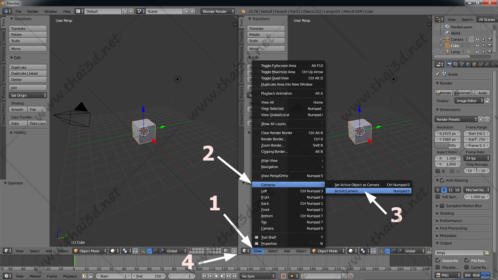 เวลาเปิด Blender เข้ามาแล้ว เราจะปรับหน้าจออย่างไรให้สะดวกต่อการใช้งาน เช่น ผมต้องการแบ่งหน้าจอไว้ทำงานทางซ้าย แล้วทางขวาแบ่งไว้เป็นมุมกล้องและ render ...จะต้องทำอย่างไรบ้าง (คลิกที่ภาพเพื่อชมภาพแบบขนาดใหญ่ได้)