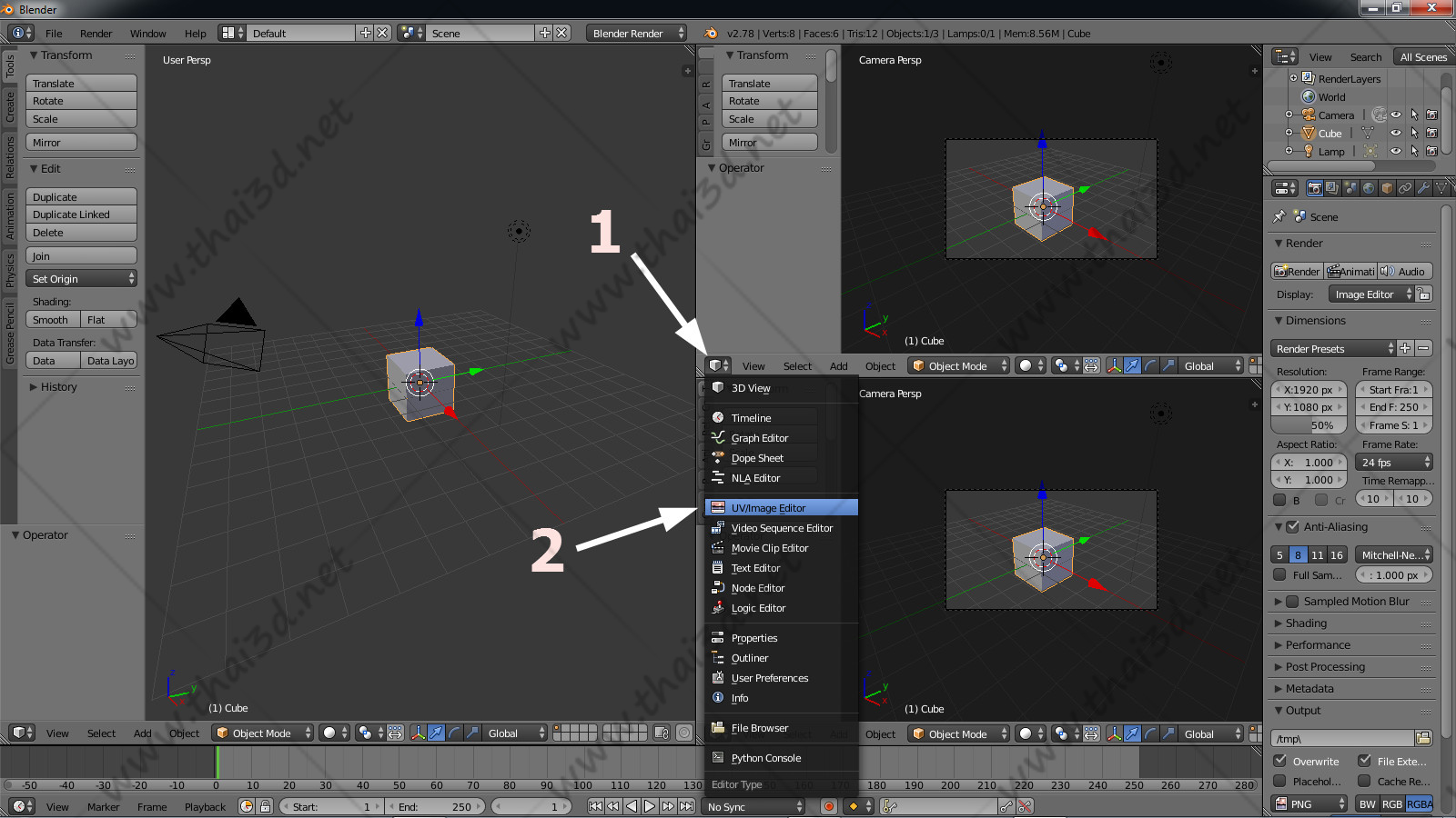 2. เลือกเป็นแบบ UV/Image Editor ซึ่งก็คือหน้าจอสำหรับดูผลการ render นั่นเอง แต่ใน Blender เขาตั้งชื่อให้เรางงไปงั้นแหละ อิอิ