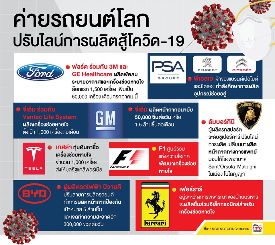ค่ายรถทั่วโลกปรับไลน์ผลิต ทำเครื่องมือรบกับโควิด-19