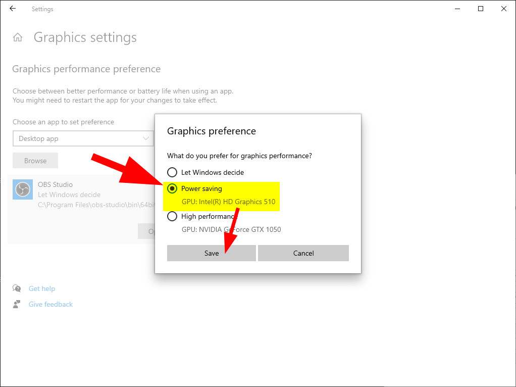 4. ทำการเลือกการ์ดจอ แล้วก็กด Save เป็นอันจบ เราจะเปิด OBS โดยไม่มีการแบงค์วงแคลชอีกแล้ว ฮ่าๆ