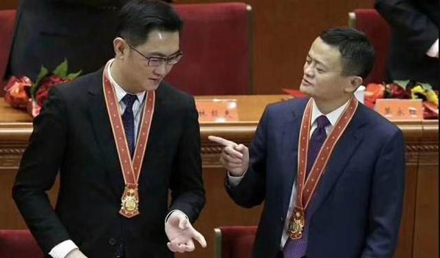 โพนี่ หม่าแห่งเทนซ็นต์ (คนซ้าย)และแจ็ค หม่า แห่งอาลีบาบา (คนขวา) พูดคุยกันหลังรับเหรียญเกียรติคุณในฐานะบุคคลสำคัญที่สร้างคุณูปการให้กับการพัฒนาเศรษฐกิจจีนระหว่างปฏิรูปเศรษฐกิจช่วงสี่สิบปีมานี้ โดยผู้นำพรรคคอมมิวนิสต์จีน สีจิ้นผิงเป็นผู้มอบเมื่อปี 2017