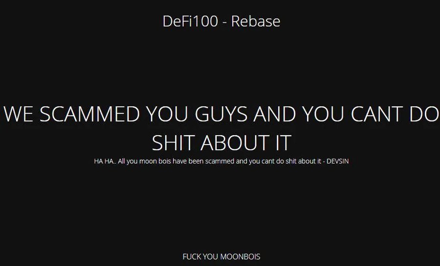 ตลาดเงินคริปโตฯ ยังคงมีเรื่องร้ายๆ เกิดขึ้นต่อเนื่อง ล่าสุด DeFi100 แพลตฟอร์มคริปโต ประกาศปิดตัวแบบกระทันหัน ยักยอกเงินของนักลงทุนไปรวมมูลค่ากว่า 32 ล้านเหรียญสหรัฐ หรือประมาณ 970 ล้านบาท เรียกว่าเป็นการเชิดเงินปล้นนักลงทุนกันดื้อๆ โดยทาง DeFi100 ได้ขึ้นข้อความทางหน้าเว็บไซต์ของตัวเองว่า “We scammed you guys, and you can’t do shit about it” ซึ่งแปลว่า “เราหลอกพวกคุณ และคุณก็ทำอะไรเราไม่ได้ทั้งนั้น”