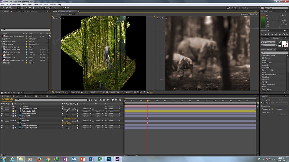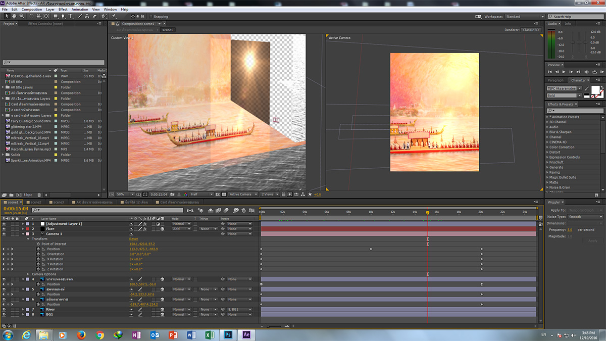 ผมใช้โปรแกรม Photoshop กับ After Effects เป็นหลักมีโปรแกรมอี่นเป็นตัวช่วยบ้าง ใช้เทคนิคการสร้างภาพแบบ 2.5D สร้าง perspective ของภาพและเคลื่อนกล้องให้เกิดการ parallax กันขึ้น