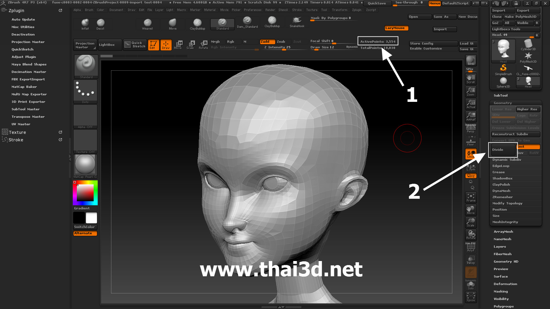 1. เมื่อเรา import โมเดลเข้ามาใน ZBrush ...ก็จะมีจำนวนโพลิก้อนในระดับต่ำ โดยสังเกตได้จากเลขตรงนี้ โดยมากจะอยู่แถวๆ 2,000 หรือ 3,000